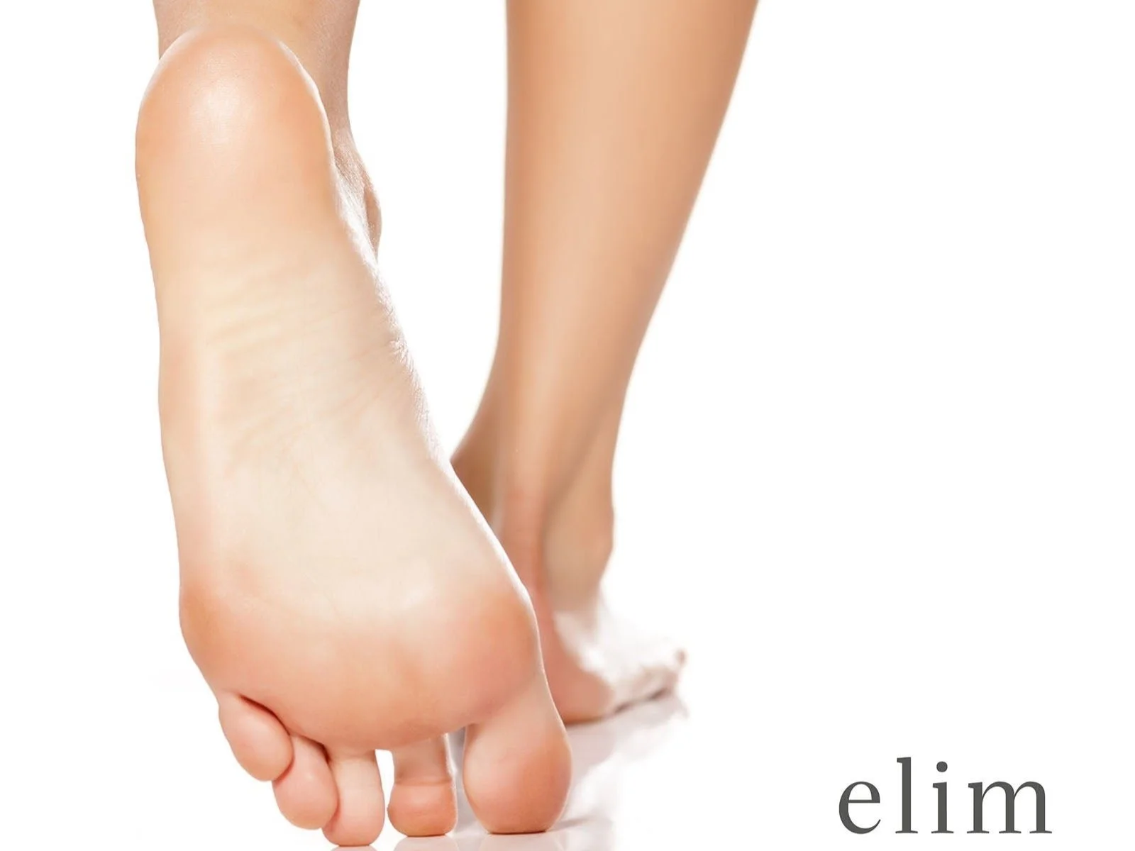 Elim uses Alkaline Peeling techniques to soften and remove hard skin and calluses. Alkaline peeling offers a safer alternative to the traditional ablative methods such as filing, blading and harsh granular exfoliants.